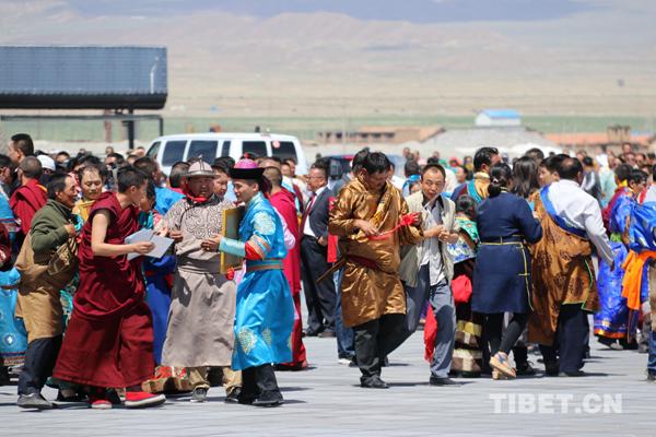 海西州的蒙古族藏族信眾們身著節(jié)日盛裝早早迎候在潔白的鹽湖旁,草原夏日的微風(fēng)吹過,藍(lán)色的哈達(dá)、經(jīng)幡和錦緞盛裝隨風(fēng)舞動??吹绞皇腊喽U到來,人們興奮地高呼“烏拉!烏拉!”這是用來表示歡迎和興奮的歡呼聲,眾人一起高呼,響徹云霄。十一世班禪為這些海西州的蒙藏信教群眾一一摩頂祈福。(中國西藏網(wǎng) 文、圖/噶哇扎西)