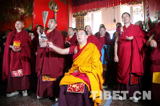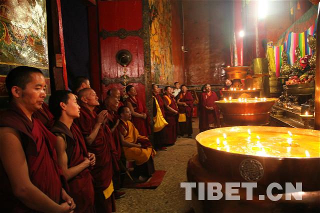 班禪還到扎什倫布寺大藏經堂、漢佛堂、強巴佛殿等佛殿和經堂,和各殿堂僧人一起念經祈禱。每到一處佛殿,班禪與陪同高僧一道領誦經文、拋灑青稞,祈愿五谷豐登、六畜興旺、國泰民安。攝影:王淑。