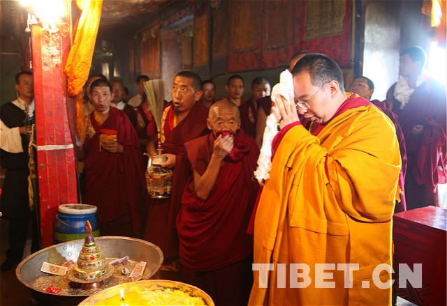 在一片嗩吶聲中,班禪來到五世至九世班禪合葬靈塔“班禪東陵扎什南捷殿”。班禪首先摘去黃色尖頂僧帽,向靈塔叩拜三次,然后同自己的經師和在場的僧人一道,念誦經文祈禱。攝影:王淑。