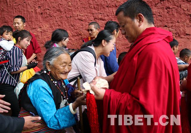 圖為接受班禪摸頂賜福后的嫫啦(老阿媽)領取金剛結。攝影:李元梅。