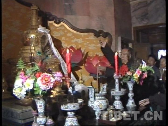 圖為1987年4月,十世班禪大師和阿沛o阿旺晉美率領(lǐng)援助西藏發(fā)展基金會(huì)籌備委員會(huì)委員朝拜靈光寺佛牙舍利塔,并親自敬獻(xiàn)哈達(dá)。