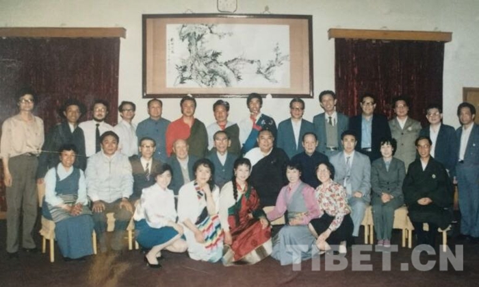 圖為1988年初,十世班禪大師看望援助西藏發(fā)展基金會(huì)新籌建的藏族文藝表演團(tuán)并與團(tuán)員代表合影。