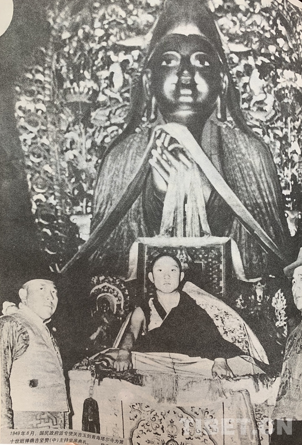 1949年8月,國民政府派專使關(guān)吉玉到青海塔爾寺為十世班禪額爾德尼o確吉堅(jiān)贊(中)主持坐床典禮。(圖片翻拍自《金鑰匙o(hù)十七條協(xié)議》 陳宗烈提供)