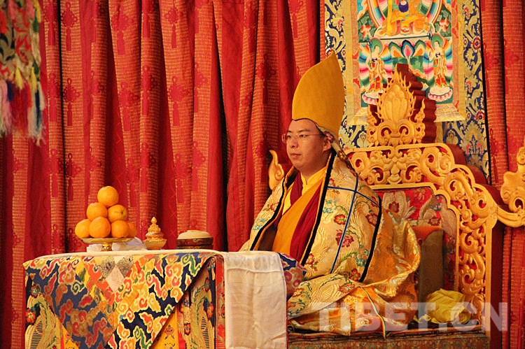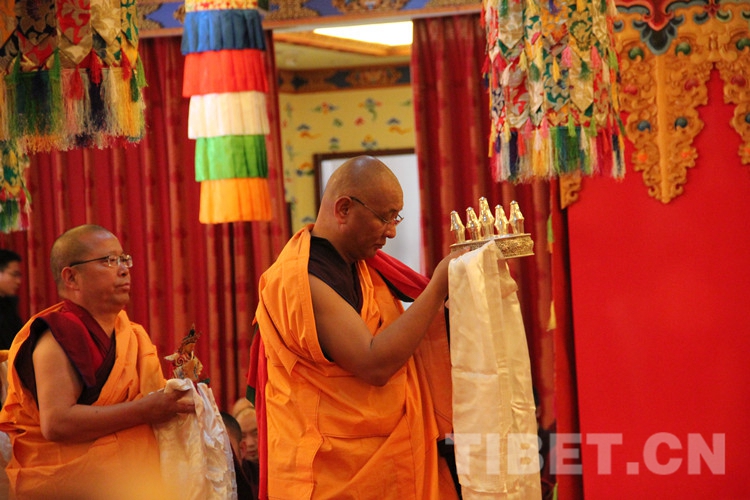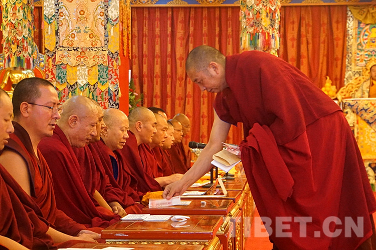 圖為土多申格副院長帶領(lǐng)經(jīng)師代表和學員代表,虔誠地向十一世班禪敬獻曼扎、佛像、佛塔、佛經(jīng)。攝影:孫健