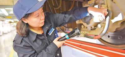王曉霞在檢查動(dòng)車組車底速度傳感器狀態(tài)。王利明攝