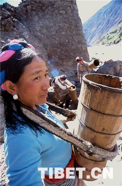鹽田里的事自古就是由女人操持的,按她們的解釋是因?yàn)槟腥舜中?,?huì)弄臟了白花花的鹽,賣不出好價(jià)去。所以男人就負(fù)責(zé)運(yùn)輸和銷售工作,他們會(huì)在女人已經(jīng)曬出小山樣的一堆鹽巴時(shí),趕著騾馬來把鹽馱走,然后跋山涉水到巴塘、德欽、昌都一帶,換錢糧或者茶葉。而女人就用自己的雙肩背起水桶,下到陡峭的江邊汲水,再沿著細(xì)小的棧道背到用木支架撐起的鹽田里,等無數(shù)桶鹵水將鹽田灌滿后,剩下的就是盼著陽光和風(fēng)快快將水分蒸干,第二天就可以收獲了。她們就這樣日復(fù)一日年復(fù)一年地將狹窄的山路踩踏了千萬遍。