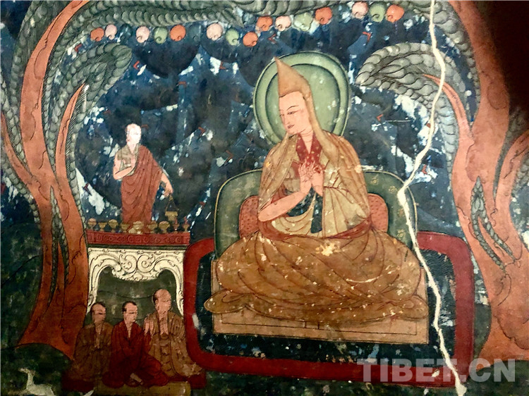 自從朗達(dá)瑪滅佛以來(lái),佛教在吐蕃遭到了致命的打擊,一些僧人避難至遙遠(yuǎn)的阿里,保存了佛教的火種,并且開(kāi)啟了藏傳佛教的后弘期。托林寺雖遠(yuǎn)在西藏邊緣一隅,卻在藏傳佛教后弘期扮演了重要的角色。11世紀(jì),受阿里地區(qū)的統(tǒng)治者絳曲沃和大譯師仁欽桑布之請(qǐng),阿底峽由納措催成杰瓦、俄列貝希繞、甲尊僧格等五人到印度迎請(qǐng)來(lái)到托林寺,駐寺三年,幫助校譯佛經(jīng)。后又至衛(wèi)藏、拉薩等地譯經(jīng),成為西藏復(fù)興佛教的一位重要人物。關(guān)于這一段歷史的表述,托林寺壁畫(huà)中有這樣一幅小圖。圖右邊戴帽者為主佛阿底峽尊者,阿底峽為古印度僧人、佛學(xué)家,聲名極盛。左上角站立者是拉喇嘛絳曲沃,左下三人分別為:譯師納措催成杰瓦、俄列貝希繞、甲尊僧格。