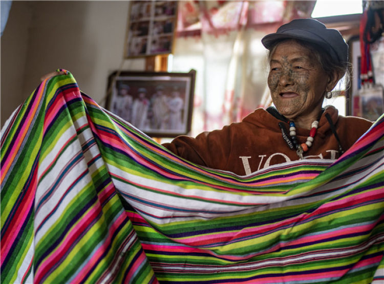 2019年4月21日,云南省貢山獨龍族怒族自治縣獨龍江鄉(xiāng)迪政當村獨龍族婦女李文仕在家里展示她親手織的獨龍?zhí)?。云南?019年宣布,獨龍族、德昂族、基諾族3個“直過民族”實現(xiàn)整族脫貧,歷史性告別絕對貧困。新華社記者 江文耀 攝