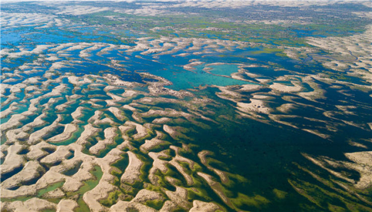 這是庫布其沙漠中利用黃河分凌減災的水進行沙漠生態(tài)修復形成的沙漠濕地景色(2018年6月9日無人機拍攝)。新華社記者 彭源 攝