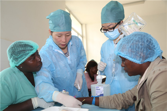 2014年12月10日,在塞拉利昂首都弗里敦,中國人民解放軍援助西非抗擊埃博拉疫情醫(yī)療隊為中塞友好醫(yī)院開展輸液培訓活動。新華社發(fā)(戴欣攝)