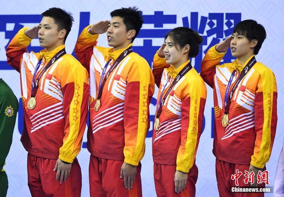 10月22日晚,在湖北省武漢市進(jìn)行的第七屆世界軍人運(yùn)動會男子4x50米混合救生接力決賽中,中國隊(duì)以1分27秒37的成績獲得冠軍。