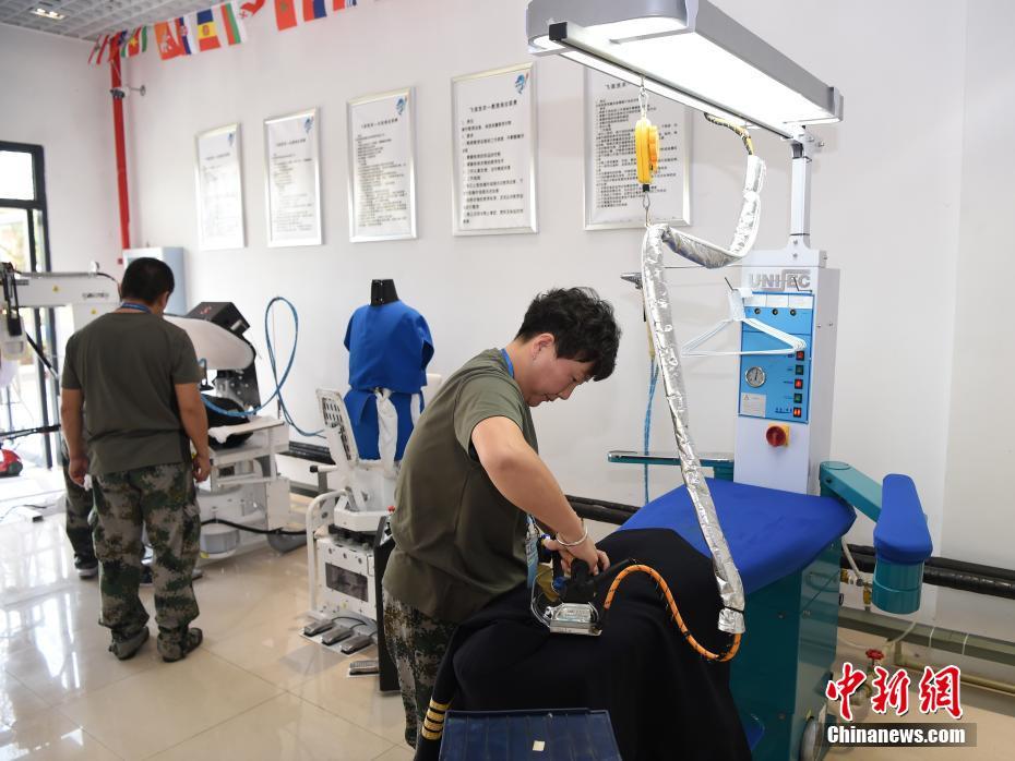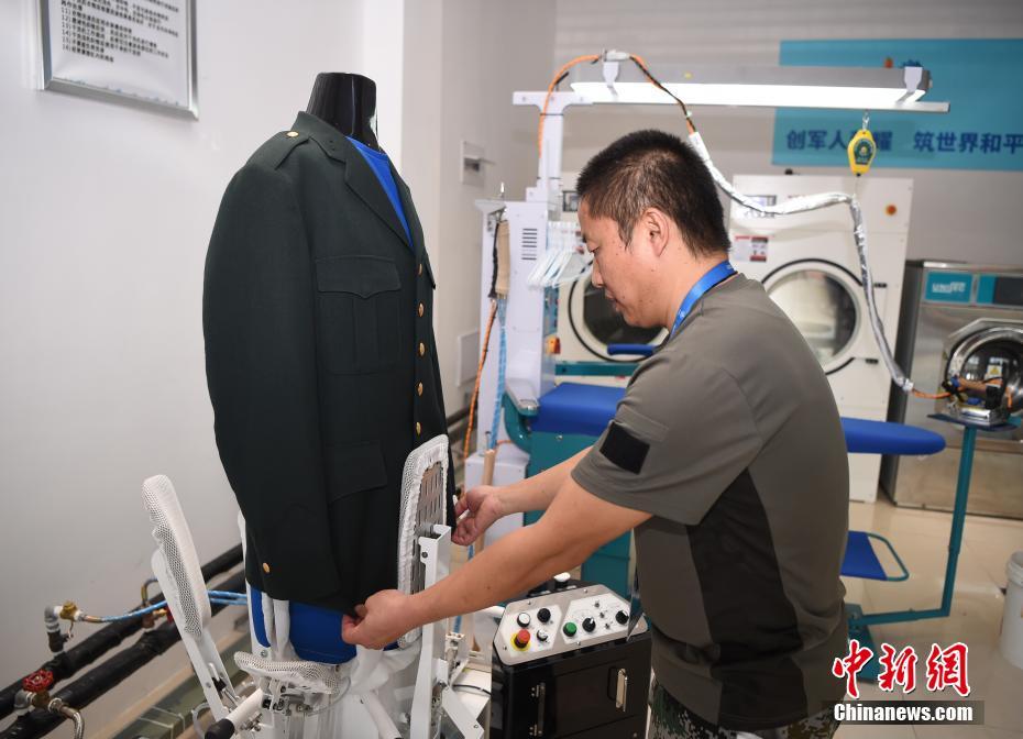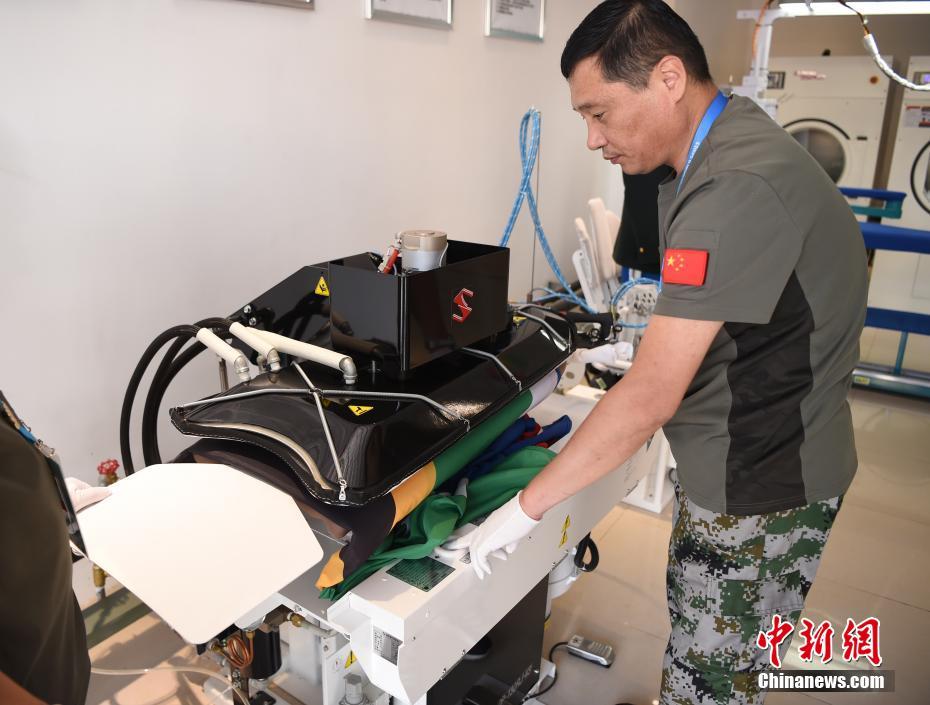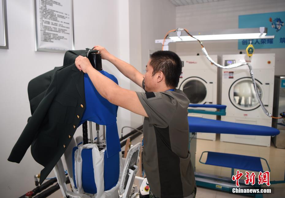龔寶翠在熨燙軍裝。洗滌服務(wù)保障組工作間面積不大,但干洗機(jī)、熨燙機(jī)、洗鞋機(jī)等各式設(shè)備一應(yīng)俱全。中新社記者 侯宇 攝