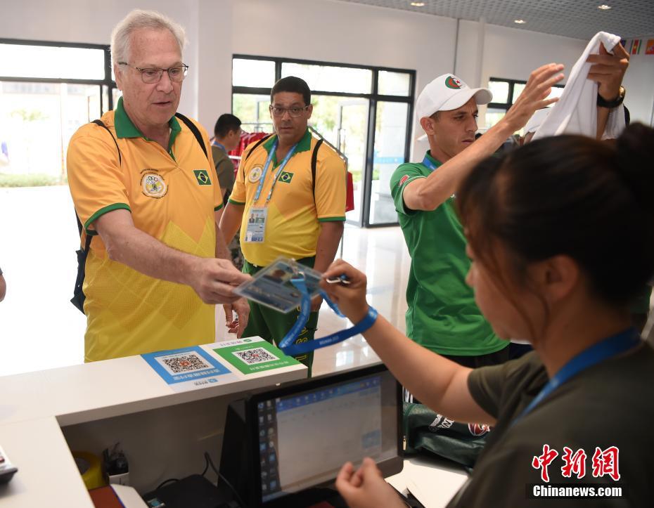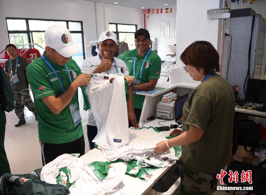 阿爾及利亞代表團(tuán)的運(yùn)動(dòng)員和官員前來領(lǐng)取洗好的隊(duì)服,對(duì)洗滌保障組精細(xì)的服務(wù)豎起大拇指。中新社記者 侯宇 攝