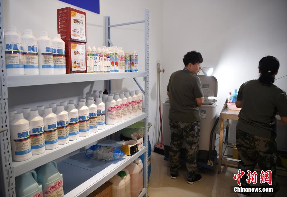 軍嫂龔寶翠和同事在工作間作業(yè)。洗滌服務(wù)保障組使用的洗滌劑等均達(dá)到了相應(yīng)的標(biāo)準(zhǔn)。中新社記者 侯宇 攝