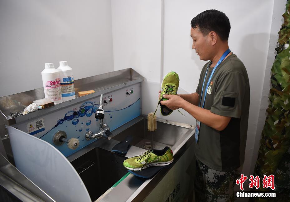 退伍軍人王勇在清洗一雙運(yùn)動(dòng)鞋。配合專用的洗鞋器具,能把鞋的各處清洗干凈。中新社記者 侯宇 攝
