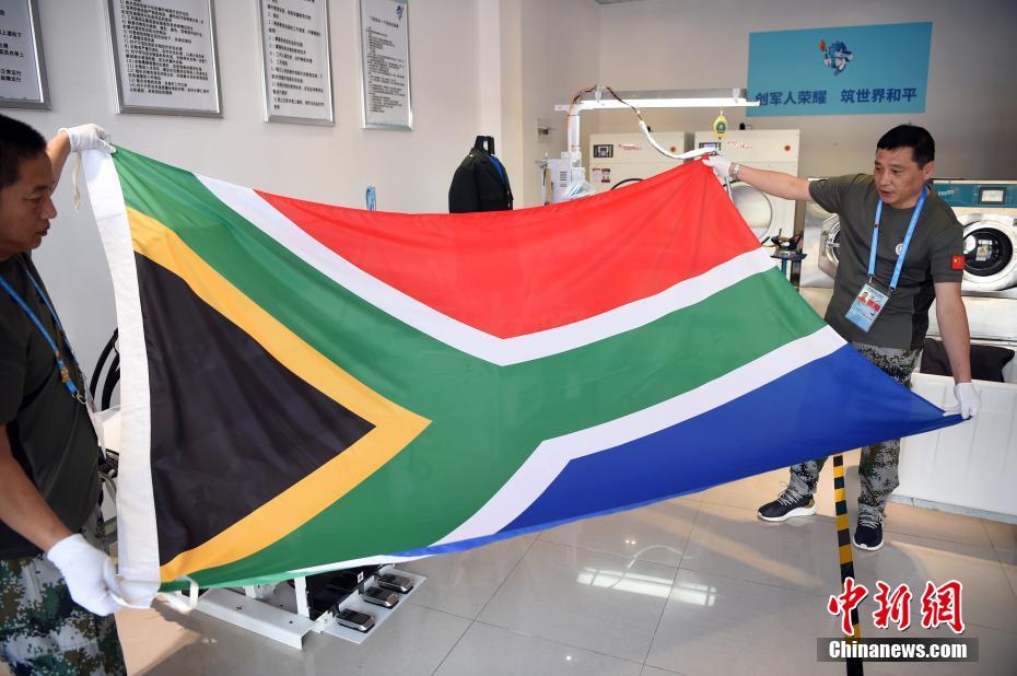 退伍軍人王繼東(左)和同事王雪峰準(zhǔn)備熨燙一面南非國(guó)旗。中新社記者 侯宇 攝