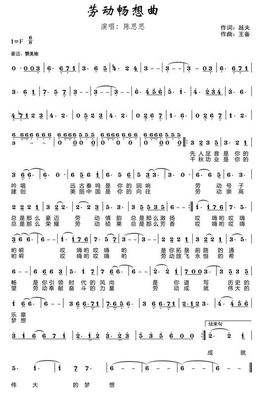 為慶祝2019年“五一”國際勞動(dòng)節(jié),向新中國成立70周年獻(xiàn)禮,中華全國總工會(huì)組織力量專門為“五一”特別節(jié)目創(chuàng)作了主題歌《勞動(dòng)暢想曲》。此作品采用藝術(shù)手法,深刻釋讀了勞動(dòng)推動(dòng)歷史發(fā)展,亦催生人類自身的科學(xué)真諦,熱情謳歌了勞動(dòng)最光榮、勞動(dòng)最崇高、勞動(dòng)最偉大、勞動(dòng)最美麗的社會(huì)風(fēng)尚,由衷抒發(fā)了對(duì)祖國和人民特別是對(duì)我們黨和工人階級(jí)的深厚情感。