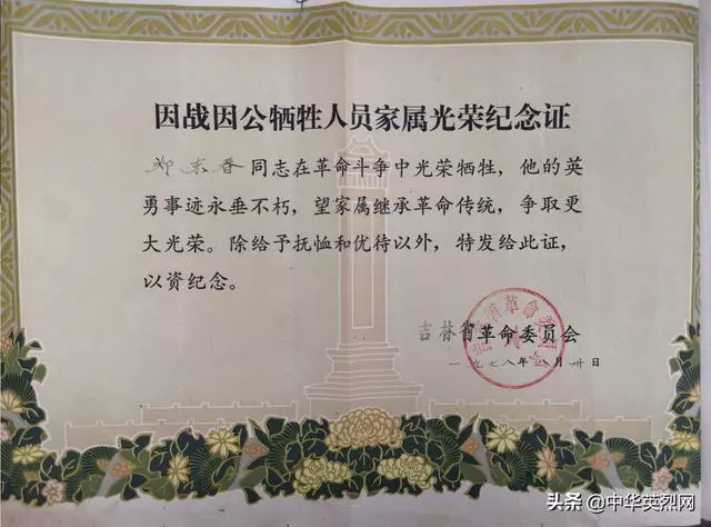 鄭東春烈士犧牲紀(jì)念證