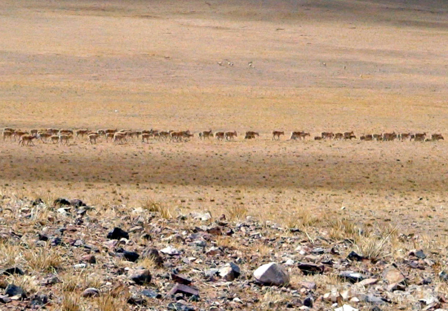 圖為羌塘國家級自然保護區(qū)正在遷徙產(chǎn)羔的成群藏羚羊(唐召明2006年攝)