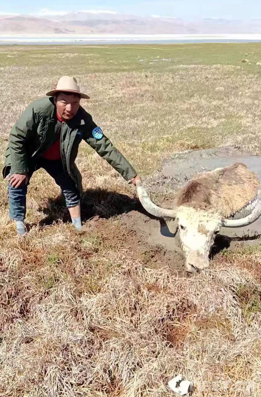圖為西藏阿里地區(qū)革吉縣野生動物保員正準備救助一頭陷入沼澤地的金絲野牦牛(野保員洛洛提供圖片)
