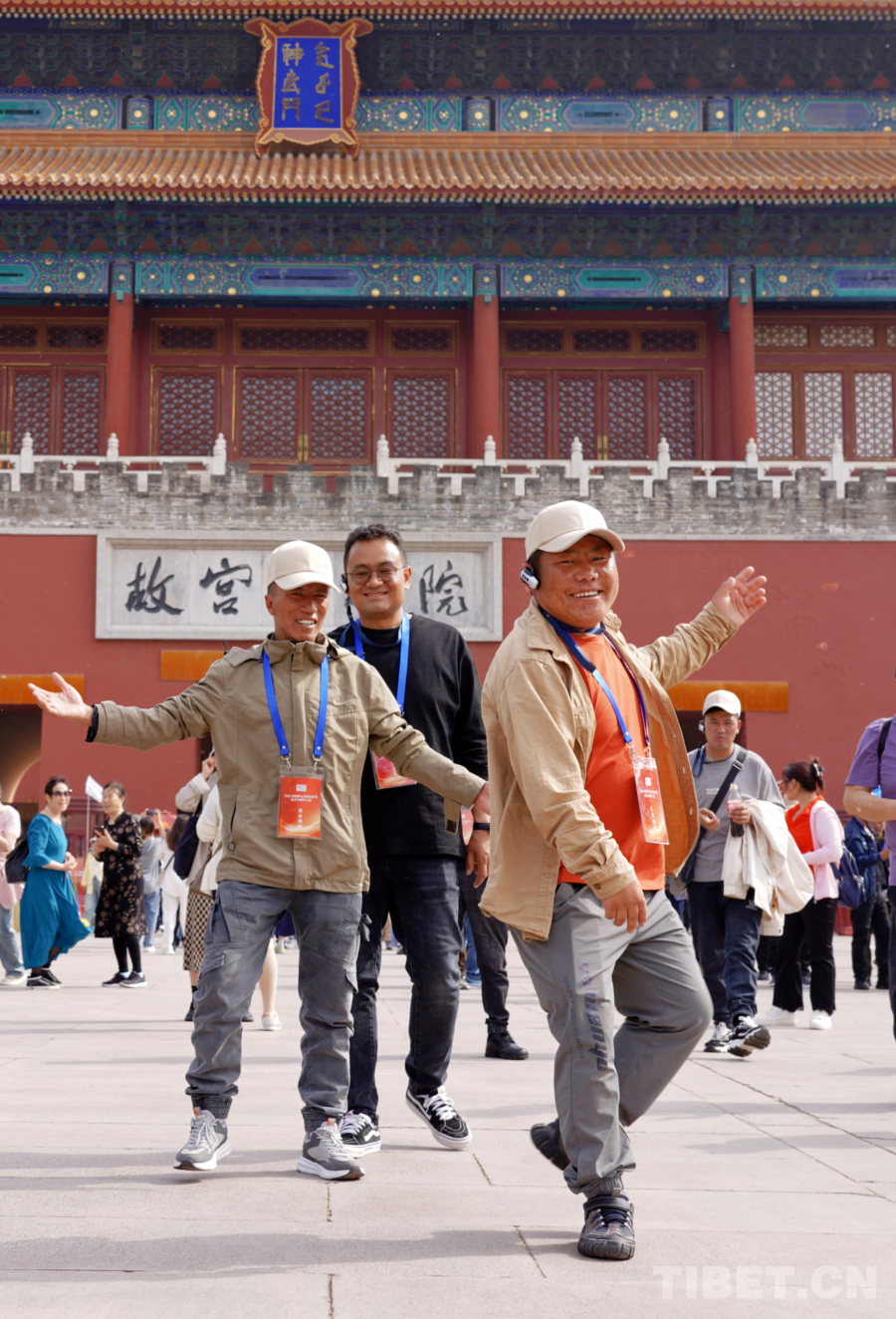 圖為羌塘國家級自然保護區(qū)尼瑪縣羅布玉杰管理站野保員扎西索朗(右一)在北京故宮博物院參觀時,情不自禁地跳起鍋莊舞(王麒龍2024年4月25日攝)