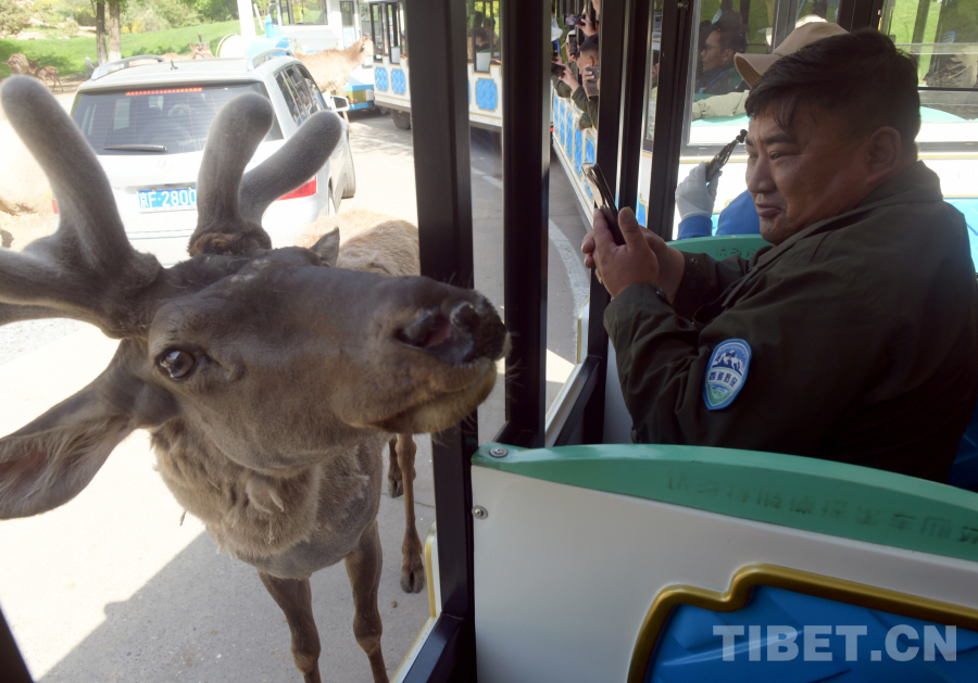 圖為西藏野保員在北京野生動物園參觀時,一只梅花鹿好奇地探頭到觀光游覽車,與西藏野保員親密接觸(唐召明2024年4月24日攝)