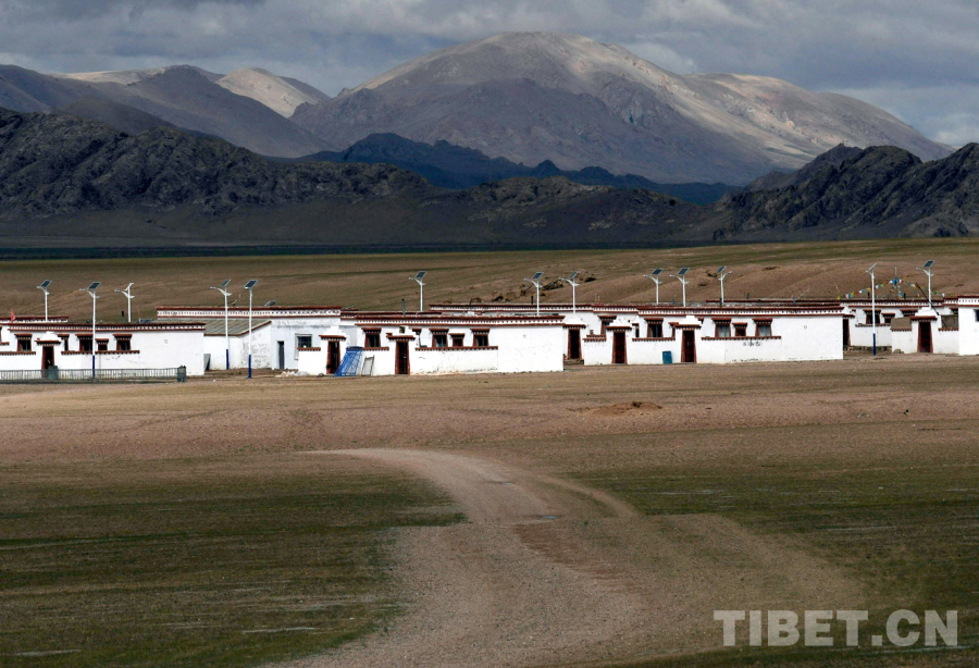 這是中國(guó)海油為尼瑪縣俄久鄉(xiāng)牧民所援建的安居房,高高的立桿是太陽(yáng)能照明路燈(唐召明2007年8月18日攝)