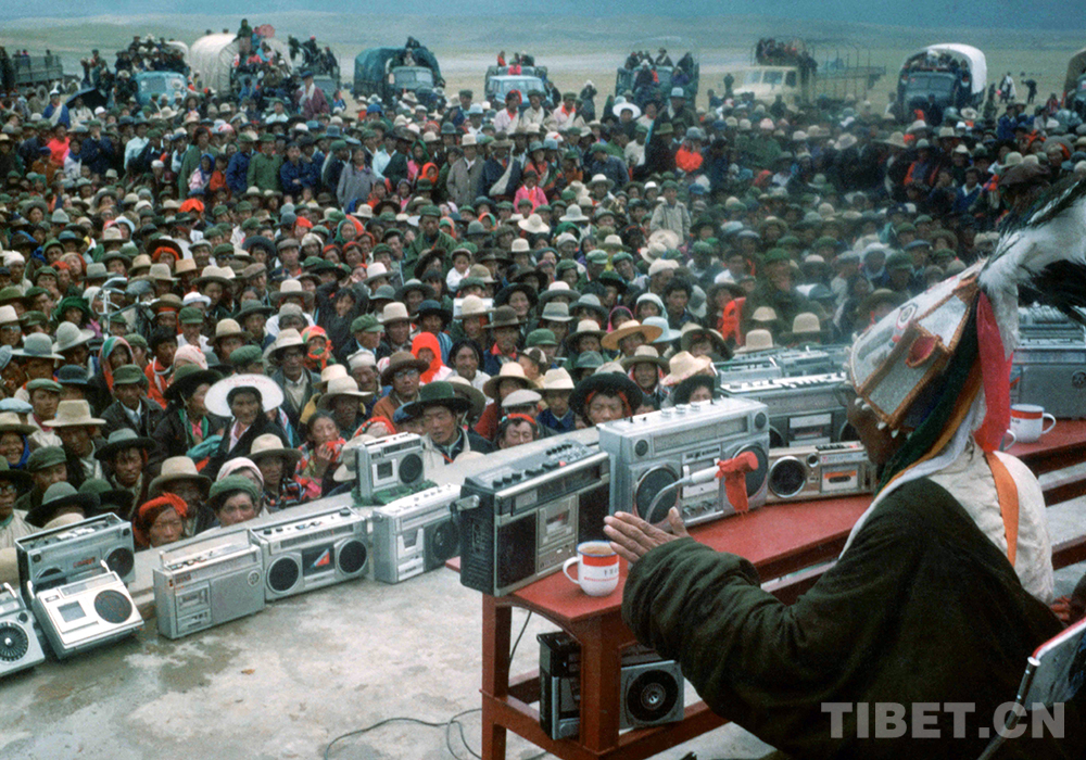 圖為說唱藝人阿達(dá)在那曲賽馬會(huì)上說唱《格薩爾》的傳奇故事,臺(tái)上擺滿了牧民群眾的各式錄音機(jī)(唐召明提供,才龍1987年前后攝)