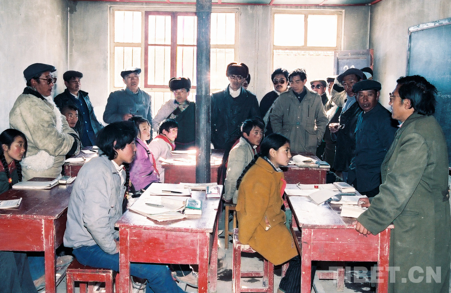 這是參加文部辦事處基層政權(quán)建設(shè)工作現(xiàn)場會“訪問團”人員在參觀文部辦事處小學(唐召明1989年12月份攝)