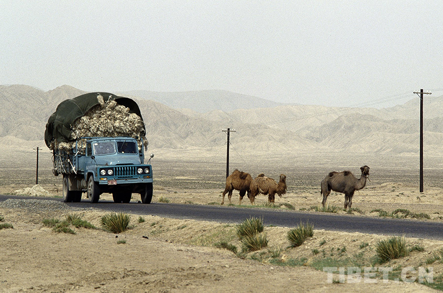 這是一輛行駛汽車與青藏公路格爾木段的吃草駱駝同框(唐召明1985年攝)