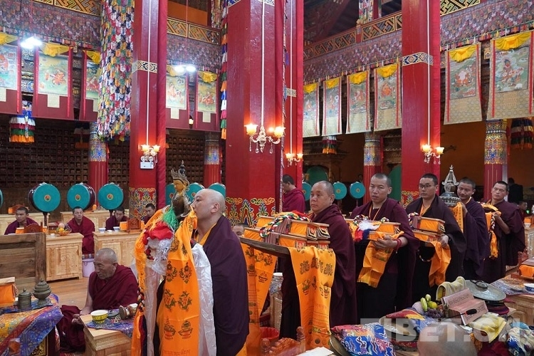 8月30日,在云霧縹緲、稻谷飄香中,十一世班禪經(jīng)曲折蜿蜒的盤山路前往仁青崩寺禮佛。在寺廟僧人的迎接下,十一世班禪前往杜康殿,隨后十一世班禪登上杜康殿寶座,僧眾集體誦經(jīng)祈福,心誠意敬、虔誠跪拜,寺院僧人向十一世班禪敬獻曼扎。十一世班禪為僧眾摸頂賜福、賜贈金剛結(jié)及法相照片、發(fā)放布施。