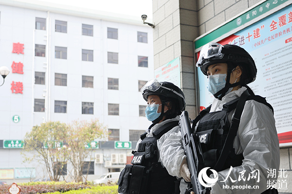 特警隊員熊吉平、孫思婕在襄陽市中心醫(yī)院發(fā)熱門診外值守(襄陽特警供圖)