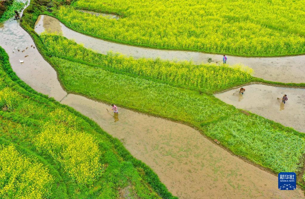 3月30日,貴州省銅仁市玉屏侗族自治縣亞魚鄉(xiāng)郭家灣村的農民在田間勞作(無人機照片)。新華社發(fā)(胡攀學 攝)