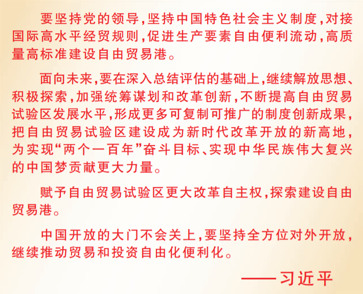 “建設自由貿易試驗區(qū)是黨中央在新時代推進改革開放的一項戰(zhàn)略舉措,在我國改革開放進程中具有里程碑意義。”
