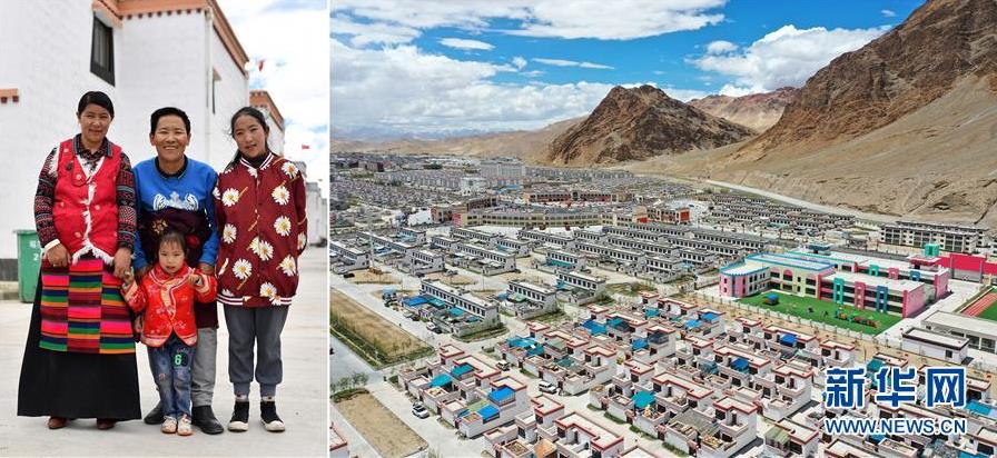 拼版照片:左圖為西藏阿里地區(qū)日土縣東汝鄉(xiāng)阿汝村村民丹木真(中)和妻子扎西拉姆(左)、女兒南嘎曲增(右)、小女兒列旺桑姆在噶爾縣康樂新居易地扶貧搬遷安置點;右圖為噶爾縣康樂新居易地扶貧搬遷安置點一角(無人機照片)。2018年,丹木真和家人搬遷到噶爾縣康樂新居易地扶貧搬遷安置點,告別了村里土木結構的舊房子,住進了150平方米的新居。安置點內醫(yī)務室、幼兒園、活動中心等設施齊全,和丹木真一家一樣,從阿里地區(qū)改則縣、措勤縣、革吉縣等地搬遷來的2000多名群眾在這里過上了安居樂業(yè)的幸福生活(7月25日攝)。 新華社記者 詹彥 攝