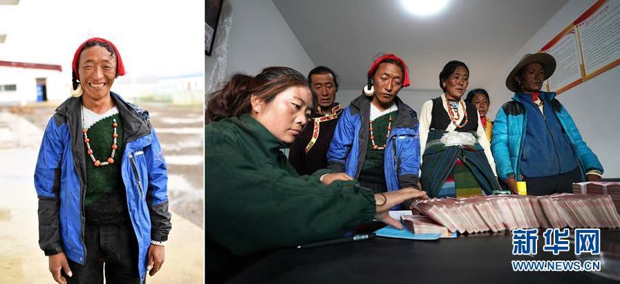 拼版照片:左圖為西藏日喀則市定日縣克瑪鄉(xiāng)幫布村村民阿羅;右圖為阿羅在幫布村牦牛養(yǎng)殖農民專業(yè)合作社領工資。2019年,阿羅把家里的100多只羊入股了合作社享受分紅,自己也加入了合作社負責放羊,每個月有3000元的收入(7月31日攝)。 新華社記者 詹彥 攝