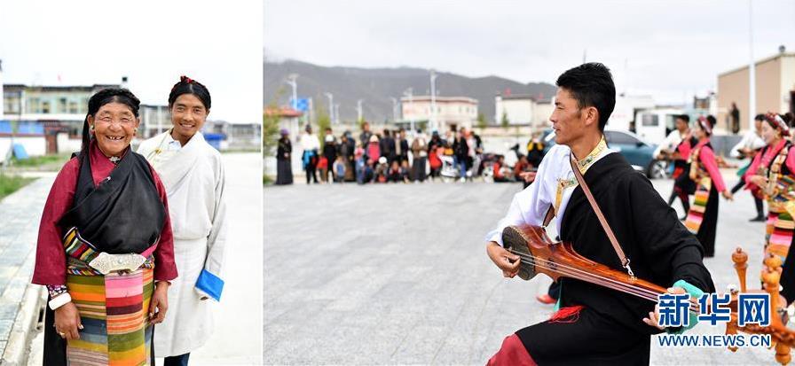拼版照片:左圖為西藏日喀則市拉孜縣查務鄉(xiāng)明瑪村村民倉瓊(左)和兒子群培次仁;右圖為拉孜縣民間藝術團在明瑪村易地搬遷點為村民表演。明瑪村舊村交通不便,資源匱乏,自然環(huán)境惡劣,發(fā)展和脫貧受到制約。2016年,當地政府經多次規(guī)劃研究,在征求村民意見后,確定將明瑪村整村搬遷。2016年10月,倉瓊和家人搬遷到了明瑪村新村。新村交通便利,文化休閑廣場、活動室、學校等基礎設施完善。倉瓊和家人商量后,在新村開了一家小商店,一年有1萬多元的收入,再加上村里養(yǎng)殖專業(yè)合作社的分紅,倉瓊一家的日子越來越好(8月2日攝)。 新華社記者 詹彥 攝
