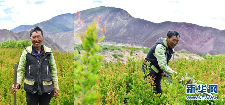 拼版照片:左圖為西藏昌都市芒康縣納西民族鄉(xiāng)加達村村民土登曲培;右圖為土登曲培在芒康縣納西民族鄉(xiāng)三江農民專業(yè)合作社的苗圃里忙碌。幾年前,土登曲培來到三江農民專業(yè)合作社打工,負責種樹和喂牛,每月有3000多元的收入(5月4日攝)。 新華社記者 詹彥 攝