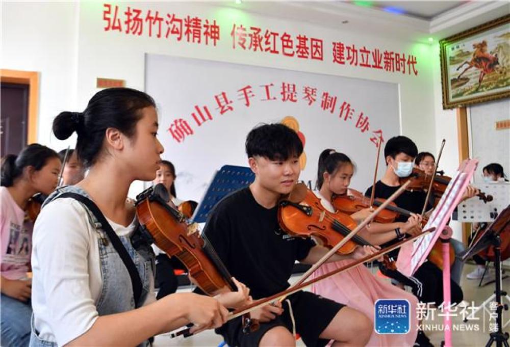 年輕人在河南駐馬店市確山縣手工提琴制作協(xié)會排練合奏曲目(7月4日攝)。新華社記者 李嘉南 攝