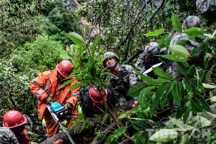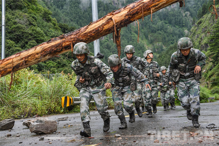 “山體滑坡帶下來的亂石和粗大的樹干擋住了去路,塌方面積不大,現(xiàn)在挖掘機(jī)正在作業(yè),跟當(dāng)?shù)厝藛T溝通,他們說預(yù)計(jì)下午能搶通?!?巴桑爬上塌方的亂石堆觀察后,跑回來跟帶隊(duì)的副營長張為鵬報(bào)告情況。