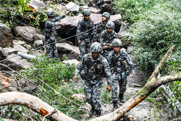 圖為巴桑和戰(zhàn)友們通過塌方亂石堆 攝影:徐治國