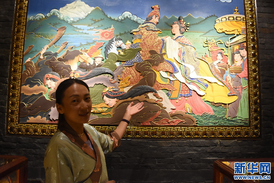 西藏日喀則康馬縣康諾瑪尼石實業(yè)有限公司講解員吳堅拉姆在介紹反映文成公主和親的工藝品(9月16日攝)。新華網(wǎng) 張宸攝