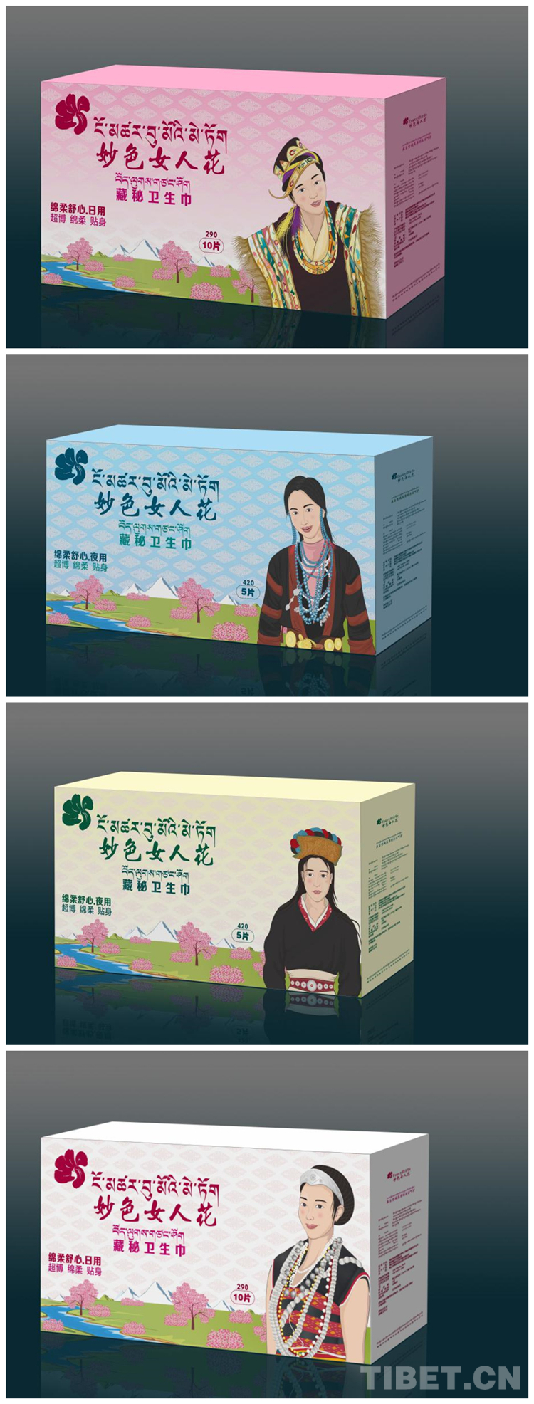 產(chǎn)品的包裝設計歷經(jīng)4個版本,拉巴次仁最終選定了身著傳統(tǒng)服飾的工布藏族、珞巴族、門巴族、僜人女性漫畫形象,他認為這樣最能代表林芝女性的風采。