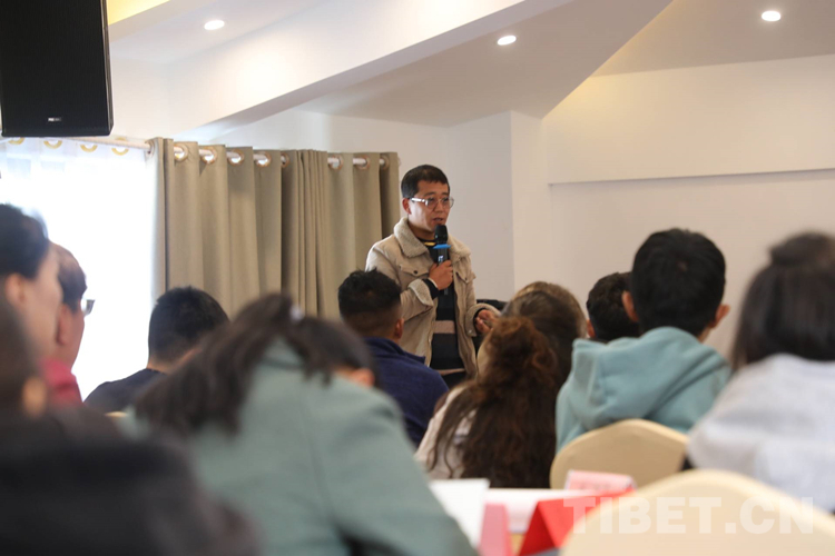圖為拉巴次仁在林芝市人社局主辦的大學生“職來職往”現(xiàn)場招聘會上,作為創(chuàng)業(yè)代表分享創(chuàng)業(yè)經(jīng)驗