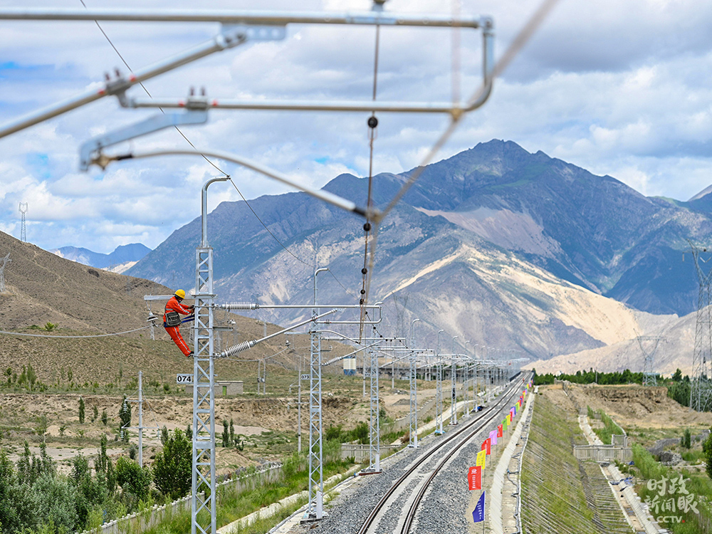 施工人員對拉林鐵路(川藏鐵路拉薩至林芝段)沿線上空架設(shè)的供電線路進行復(fù)檢。拉林鐵路是西藏首條電氣化鐵路,正線全長435.48公里。