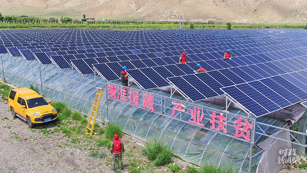 湖北襄陽某供電公司援藏幫扶工作人員檢修光伏發(fā)電設(shè)備,解決當?shù)仞B(yǎng)殖戶和種植戶用電需求。