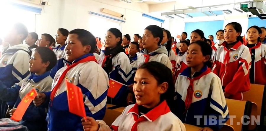 圖為四川省甘孜州石渠縣第二完全小學學生代表與醫(yī)療專家們一起高唱國歌 攝影:劉莉