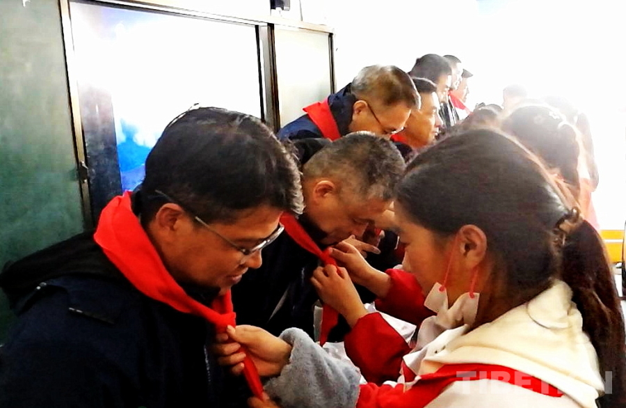 圖為四川省甘孜州石渠縣第二完全小學學生為醫(yī)療專家們獻上鮮艷的紅領巾 攝影:劉莉