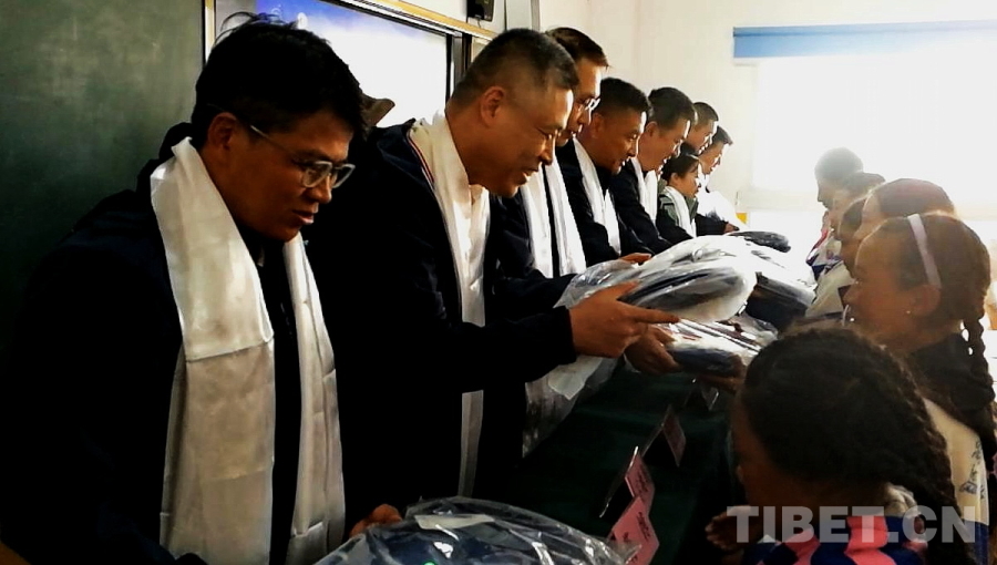 圖為醫(yī)療專家們向四川省甘孜州石渠縣第二完全小學學生贈送學習用品 攝影:劉莉