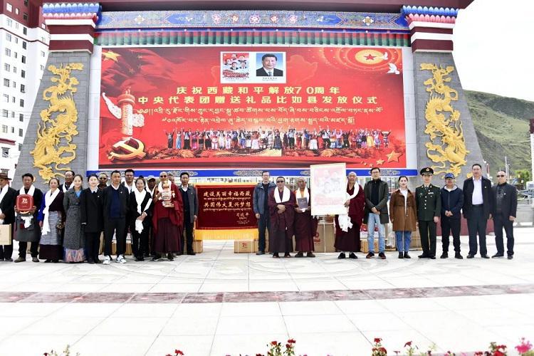 中國西藏網(wǎng)訊 為表達(dá)以習(xí)近平同志為核心的黨中央的親切關(guān)懷和全國人民的深情厚誼,出席西藏和平解放70周年慶?;顒?dòng)的中央代表團(tuán)向西藏贈(zèng)送多項(xiàng)紀(jì)念品。8月23日下午,西藏自治區(qū)那曲市比如縣隆重舉行中央代表團(tuán)贈(zèng)送禮品發(fā)放儀式。